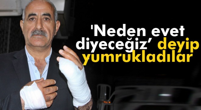 "Birkaç kişi geldi. Bize sert bir şekilde ‘neden evet vereceğiz, neden hayır vereceğiz, bize açıklar mısınız?’ diye söyledi. Amaçlarının provokatörlük olduğu belliydi. Hareketlerinden belliydi. Biz de, ‘Beyefendi biz size ne anlatalım, bak biz burada broşür veriyoruz, vatandaşa ikram ediyoruz, zaten iki aydır basında, yayında her tarafta insanların niçin evet vereceği, niçin hayır vereceği belirtilmiş, biz size ne anlatalım? Biz stantta broşür dağıtıyoruz. Lütfen broşürlerinizi alın buradan uzaklaşın’ dedik. O anda mahalle başkanımız Serhat Bey, ‘Lütfen uzaklaşır mısınız?’ dediği anda genç çocuk yumruk attı. Ben olayı ayırmak istediğimde bana da yumruk ve tekmeyle cevap verdiler. Olayın içine çektiler parmaklarım kırıldı, gözlüğüm parçalandı. Ondan sonra olay arkadaşlara sirayet etti. Hiç istemediğimiz yerlere gitti. Bizim amacımız belli, evet oylarının çıkması, ama onların amacı provoke etmek, olay çıkarmak. Gözlüğümü ve parmağımı kıranlardan şikayetçiyim."