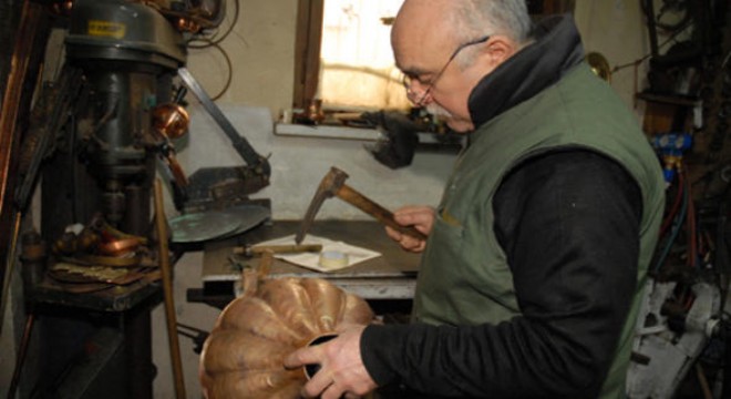 “İşin sırrı, el emeği ve uygun çekiç” diyen bakır ustası Şener Kartal, mesleğe başladığı 14 yaşından beri kendi oyduğu tahta saplı demir çekiçlerle çalışıyor