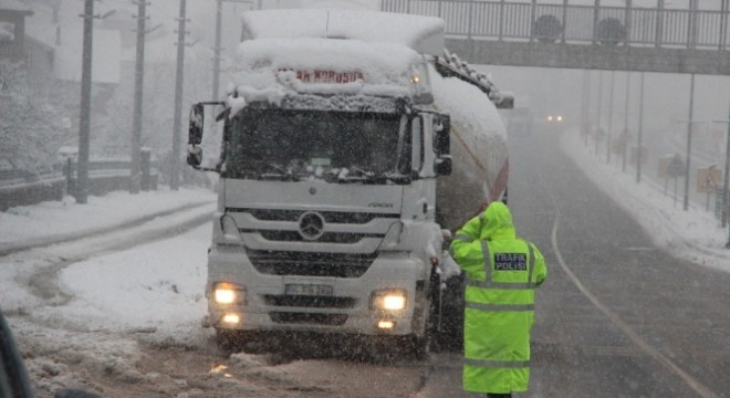 Bolu Dağı'nda kar yağışı etkili oluyor. Kar yağışı nedeniyle Düzce İl Emniyet Müdürlüğü Bölge Trafik ekipleri, Kaynaşlı mevkiinde tırların geçişine izin vermezken araçlarda kar lastiği uygulaması yapıyor. Yetkililer kar yağışının aralıklarla devam edeceğini bildirdi.