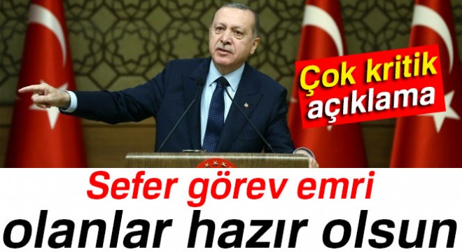 Erdoğan, salondan gelen çağrılara da “Afrin’e gitme kararı aldıktan sonra biz sizi buralarda bırakmayız merak etmeyin. Sefer görev emri alanlar hazır olsun” diye cevaplandırarak sözlerini şöyle sürdürdü: