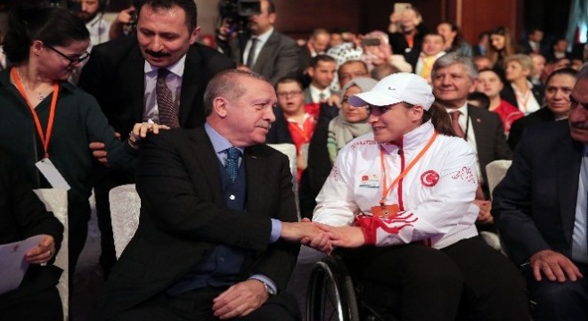 “İyiliği gösterişte, adaleti yollarda, sevgiyi sosyal medyada arayanlar elbette medeniyetimizin bu derin sırrına eremezler” açıklamasında bulunan Erdoğan, “Biz geçtiğimiz 15 yılda iyilikte ve hayırda yarışmanın faziletine inanarak, adeta ilmek ilmek örerek bir sosyal devlet inşa ettik. İktidarlarımız döneminde engellilerimize, çocuklarımıza, kadınlarımıza, yaşlılarımıza, gariplerimize, şehit yakınlarımıza, gazilerimize ve tüm ihtiyaç sahiplerine hizmet için 235 milyar liralık bir kaynak kullandık. Milletimizi muasır medeniyet seviyesinin üzerine çıkartmanın mücadelesini verirken bu şekilde gönül medeniyetimizi de ihya etmenin gayreti içinde olduk. Önce kendimize şu soruyu sormamız gerekir; görememek, duyamamak, konuşamamak, yürüyememek, algılayamamak bir eksiklik midir? Asla değildir. Bazı tespitler yapıyorum, ışığı kapattığımızda biz de göremeyiz, duvarları yalıtılmış bir odaya girdiğimizde biz de duyamayız, yabancı bir ülkeye gittiğimizde biz de lal oluruz, ayaklarımız uyuştuğunda biz de yürüyemeyiz, uykuya daldığımızda çevremizle irtibatımızı kaybederiz. Daha da önemlisi yarın hangimizin bu engellerle sürekli yaşamayacağının garantisi var mıdır? Her engelli doğuştan bir engelle doğmaz. Kimi merhum Aşık Veysel gibi hastalık sebebiyle, kimi ampute milli takımımızın kaptanı Osman Çakmak gibi terörle mücadele sırasında, kimi iş veya trafik kazasında daha sonradan engelli olabilir. Bak Avrupa Şampiyonu oldular. Takım burada, ama içlerinde hala bekarlar var. Onları da bir ön önce kaptan Osman evlendirecek, söz verdiler bana. Önemli olan bu kardeşlerimizin engellerinin ne olduğu, nasıl olduğu değil, bu kardeşlerimize nasıl baktığımızdır. Engelli kardeşlerimizin durumunu tıpkı erkek veya kadın olmamız gibi, tıpkı düz veya kıvırcık saçlı olmamız gibi, tıpkı mavi veya kahverengi gözlü olmamız gibi insani bir gerçek olarak kabul ettiğimizde diğer tüm sorunların kendiliğinden çözüm yoluna girdiğini görürüz” ifadelerini kullandı.