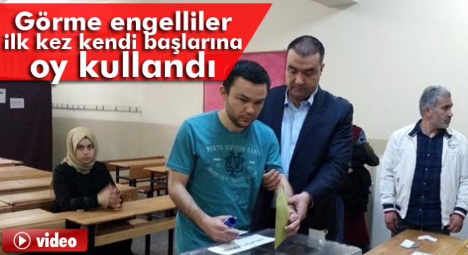 Yüksek Seçim Kurulunun(YSK) görme engelli vatandaşlar için bu yıl ilk defa yürürlüğe koyduğu oy şablonu ile görme engelli vatandaşlar ilk kez kendi başlarına oylarını kullandı. YSK’nın yürürlüğe koyduğu oy şablonu sayesinde 28 yaşındaki görme engelli Murat Taşkın, ilk defa kendi başına oy kullandı. Görme engelli genç, Eyüp Belediyesi tarafından özel olarak araçla evinden alınarak oy kullanacağı Şehit Öğretmenler İlkokuluna getirildi. Oy kullanacağı sınıfa kadar Eyüp Belediyesi yetkilileri ve annesinin refakatiyle gelen Taşkın, sandık görevlilerinden aldığı bilgi sonrasında kabine tek başına giderek oyunu kullandı.