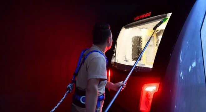 Metro vagonları ekipler tarafından su ve özel cihazlarla kirden arındırılırken, koltuklar, camlar, yolcu tutamakları temizleniyor. Vagonl