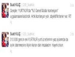 Bakan Kılıç, sosyal paylaşım sitesi Twitter hesabı üzerinden YURTKUR'la ilgili yapılan değişikliklerle ilgili takipçilerine bilgi verdi. Kılıç, daha önce YURTKUR'da yüzde 5 olan genel müdür kontenjanını kaldırdıklarını ve yurt ücretlerinin yaz aylarında da aylık ödenmesine ilişkin kararı onayladıklarını belirtti. Kılıç açıklamasında, "Gençler, YURTKUR'da 'yüzde 5 genel müdür kontenjanı' uygulamasını kaldırdık. Artık kontenjan yok, objektif kriterler var. 310 bin gencin evi YURTKUR yurt ücretlerinin yaz aylarında da aylık ödenmesine ilişkin kararı dün imzaladım. Hayırlı olsun" dedi.ANKARA /