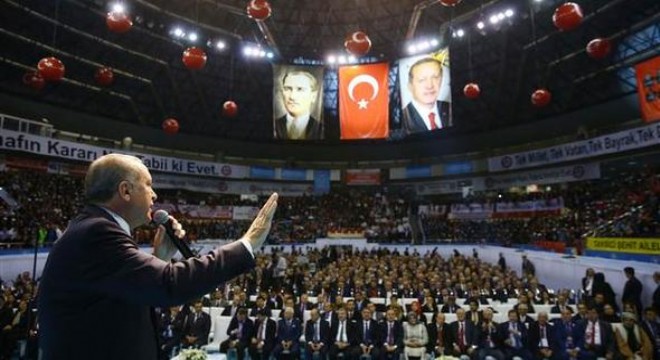 “Siyasette her türlü tercihe görüşe saygımız var ama bir şartla. Dürüst olunması delikanlı olunması şartıyla. Bizde Anayasa değişikliğine karşı çıkanlara diyoruz ki delikanlı olun ciğerimizi yiyin” diyen Cumhurbaşkanı Erdoğan, "Ana muhalefet, anayasa değişikliği konusunda, maalesef doğruları söylemiyor. Hatta konuştuklarının tamamı yalan, tamamı yanlış, tamamı iftira desek yeridir. Mesela diyorlar ki 'rejim değişecek, rejim tehlikede.' Yalan, rejim falan değişmiyor” şeklinde konuştu.