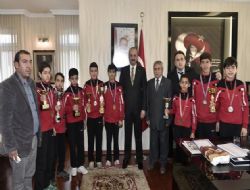 Kasırga Tekvando Spor Kulübü'nün şampiyon tekvandocuları , antrenörleri Osman Kara eşliğinde Mamak Belediye Başkanı Mesut Akgül'ü makamında ziyaret etti.