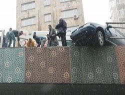 Kontrolden çıkan otomobil, köprünün korkuluklarına çarptı. Korkuluktan kopan demir parçaları yayanın kafasına düştü. Kaza sonrası, yayalar asılı kalan otomobilin altında yürümeyi sürdürdü.